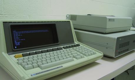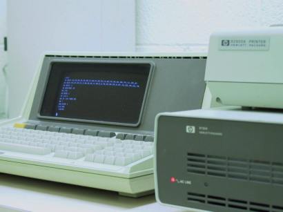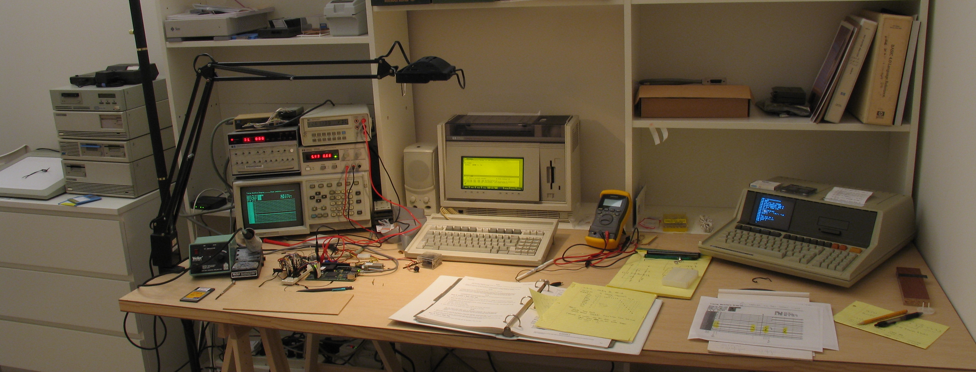 Starting from the far left, you can see and HP-9111A digitizer, a stack of drives (IEM-4400 tape drive, HP-9153A, HP-9121D, and HP-9133H), an HP-59401A HP-IB Analyser, an HP-3460A Multimeter, an HP-E3610 DC Power Supply, an HP-1630D Logic Analyzer, an HP Integral PC, and my favorite HP-85A.